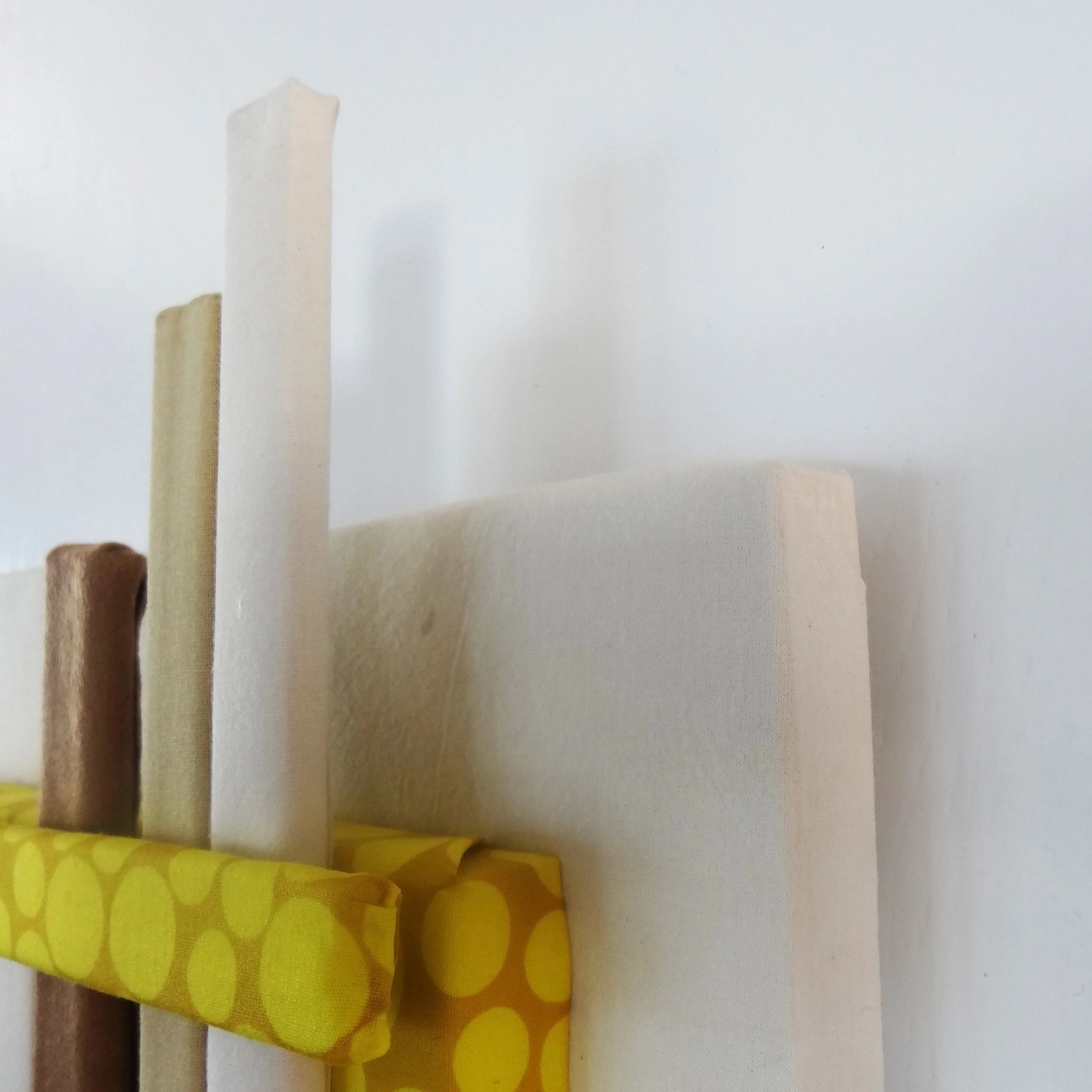Enhance your home with this striking, handcrafted wall art piece that embodies modern simplicity and geometric elegance. Featuring a dynamic arrangement of textured fabric wooden bars in earthy tones of brown, beige, and cream, layered over a vibrant yellow background with a playful polka dot pattern, this artwork adds a unique touch to any room. The contrast between the natural wood textures and the bold yellow design creates a captivating visual balance, perfect for modern and minimalist interiors.