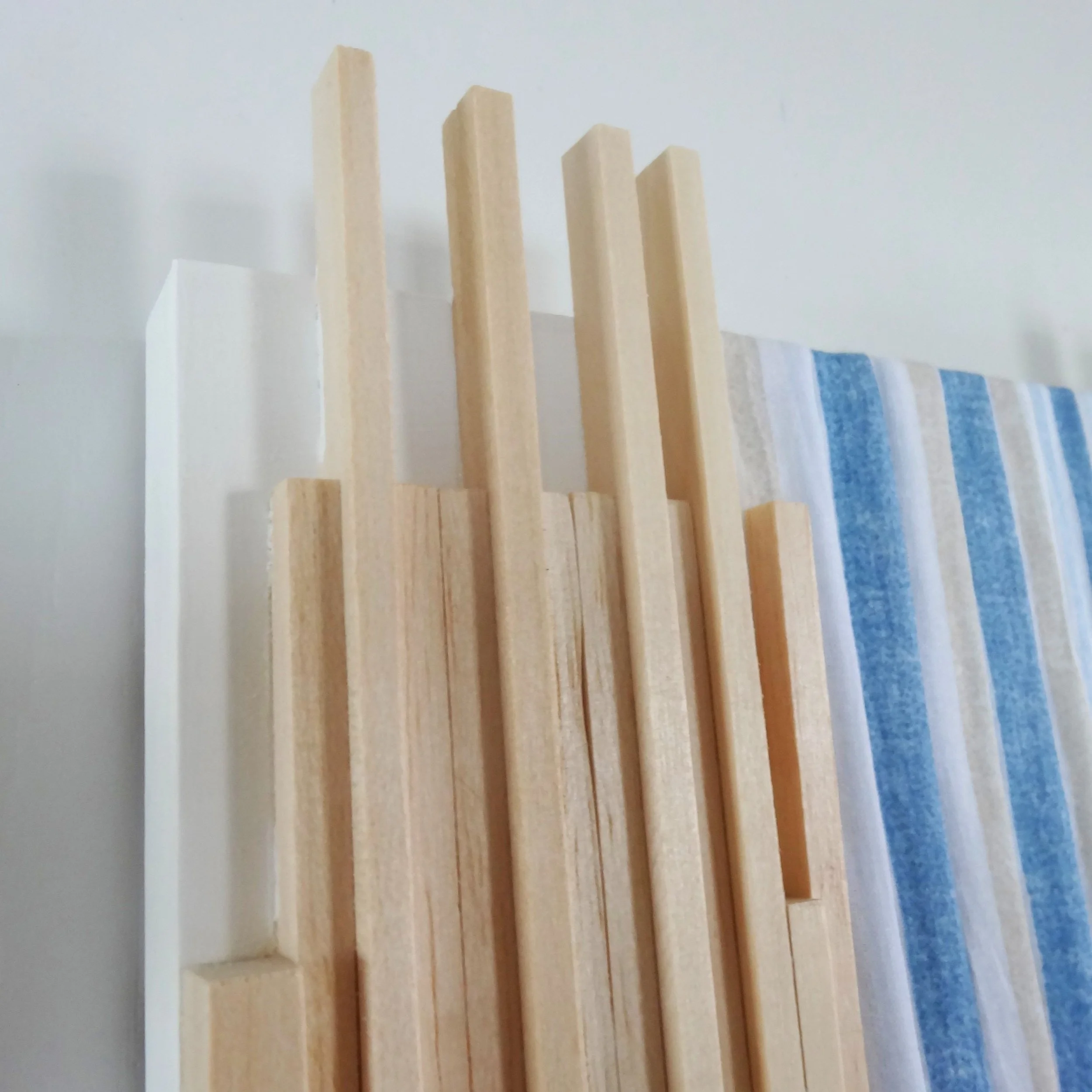 Enhance your decor with this elegant wall art piece that captures the essence of coastal simplicity. Featuring natural wooden slats arranged alongside a backdrop of soft blue and white fabric stripes, this artwork evokes the serene beauty of the seaside. The minimalist design and soothing color palette make it an ideal addition to spaces that seek to create a calm and airy atmosphere.